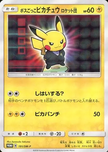 071/SM-P サトシのピカチュウ ※入手方法:サトシのピカチュウGET キャンペーン ![]() | 販売価格:調査中 買取価格:20,000円 |
